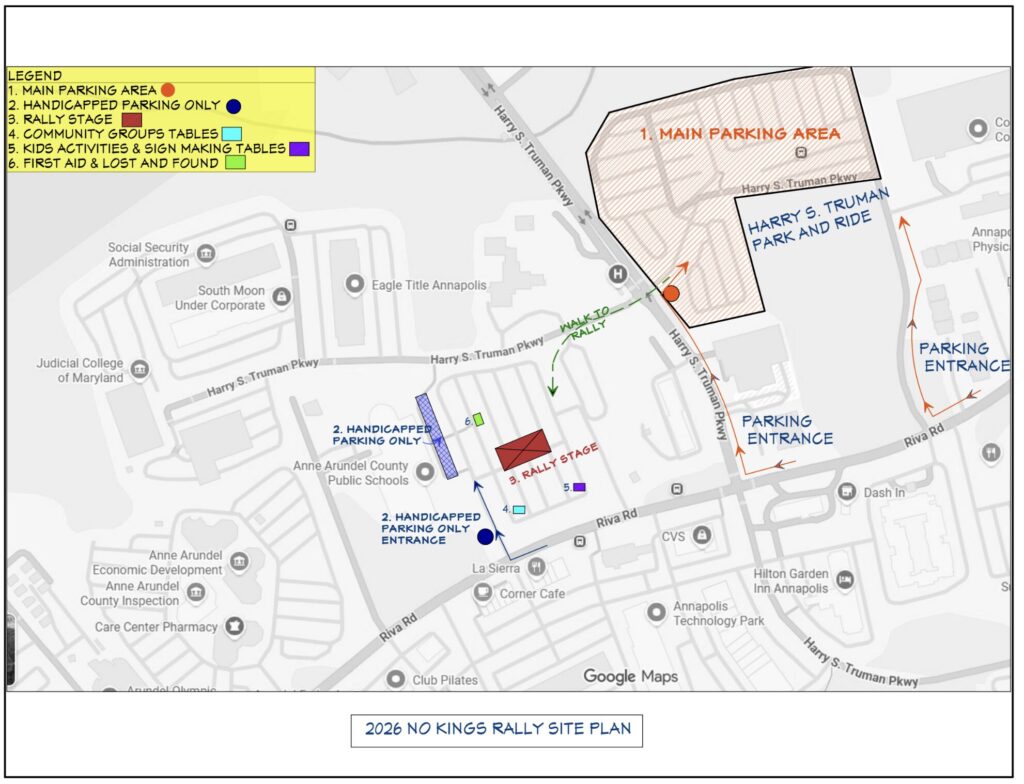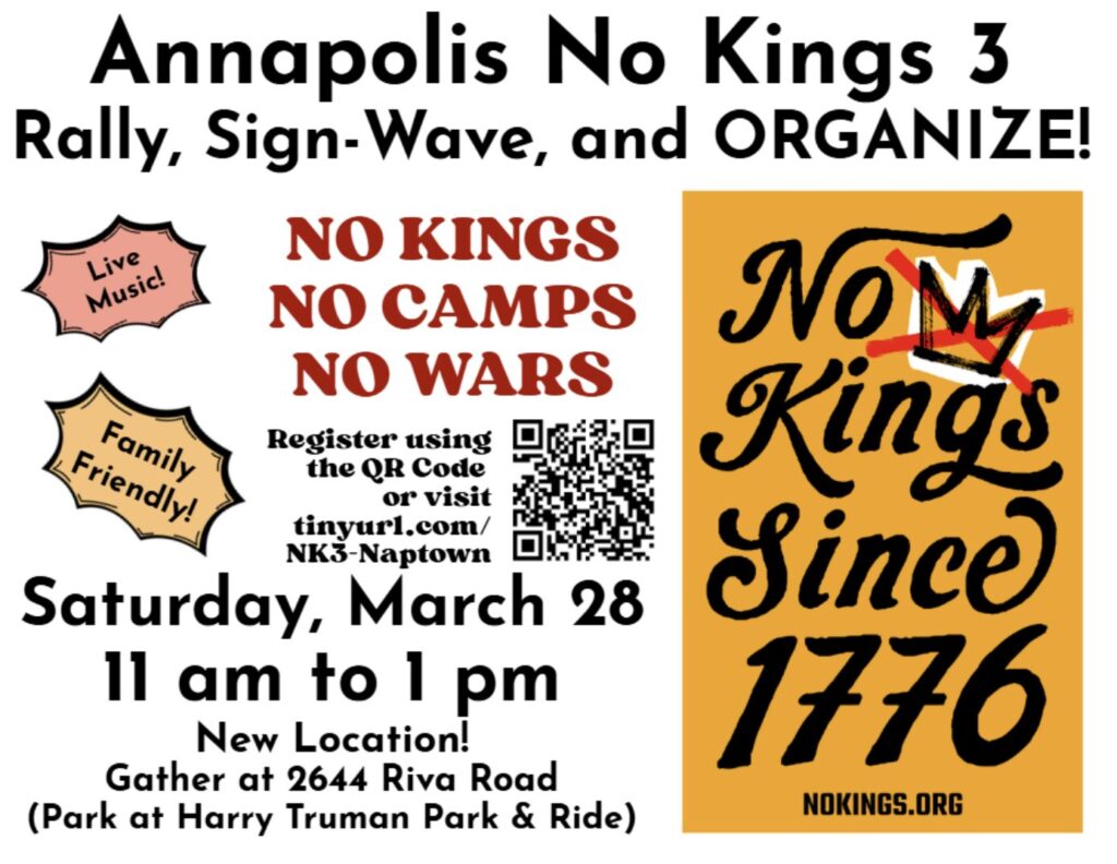 Join your neighbors for this family friendly No Kings event, featuring a rally with speakers and live music, a sign-waving procession along Riva Road (from the rally to Bowens’ Farm Supply), and tables with voter registration, kid’s crafts, sign-making, and opportunity to connect with various community groups. Location: The AA County Board of Education parking lot, 2644 Riva Road (11 AM to 1 PM ).